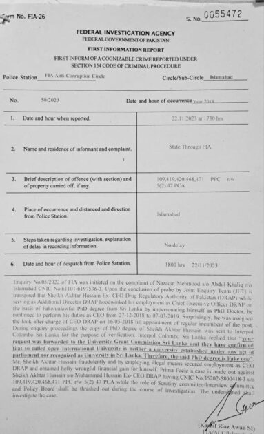 جعلی ڈگری کیس،سابق چیف ایگزیکٹیو آفیسر ڈرگ ریگولیٹری اتھارٹی شیخ اختر کو ایف آئی اے نے گرفتار کر لیا