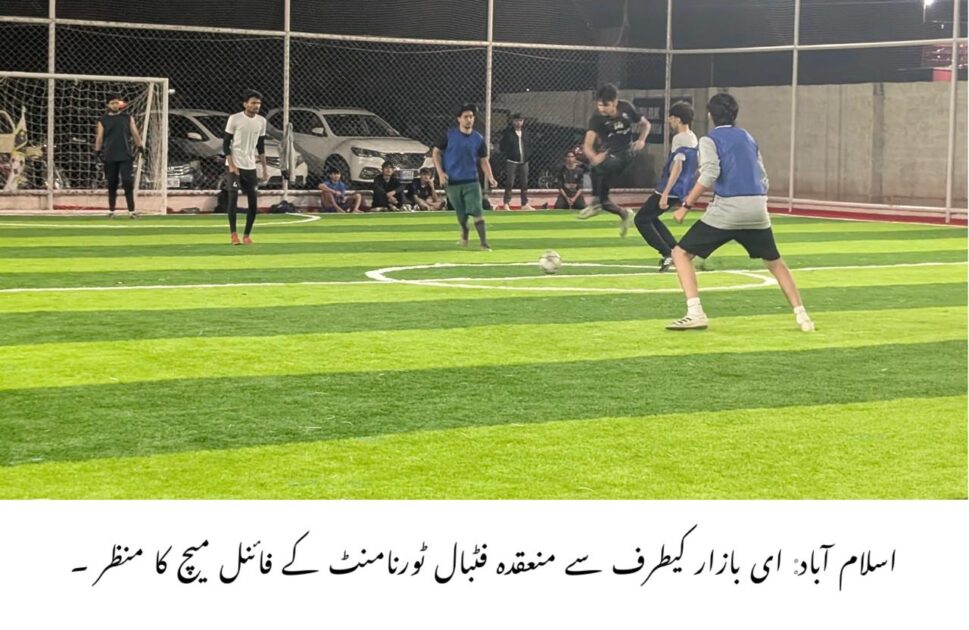 اسلام آباد (سید جاوید حسن شاہ) ای-بازار، نے اسلام آباد کے ایم ایم ایم ایرینا میں تین روزہ فٹ بال ٹورنامنٹ کا کامیابی سے انعقاد کیا۔ اس ایونٹ میں راولپنڈی/اسلام آباد سے 28 ٹیموں کے 250 سے زائد کھلاڑیوں نے حصہ لیا،ای بازار جو ایک معروف ای کامرس پلیٹ فارم ہے کی طرف سے منعقدہ ٹورنامنٹ میں مسابقتی میچز ہوئے،ای-بازار کے مارکیٹنگ مینیجر عاشر خان نے ہر میچ کے بہترین کھلاڑیوں کو انعامات سے نوازا۔گرینڈ فائنل ٹیلنٹ اور عزم کا مظہر تھا جو ایک سنسنی خیز فتح کی جشن میں اختتام پذیر ہوا۔ایونٹ کے اختتام پر ای-بازار کے سی ای او میاں عمران کاکا خیل نے ٹرافیاں اور نقد انعامات تقسیم کیے، ان کی غیر معمولی کارکردگی اور کھیل کے جذبے کو تسلیم کیا۔