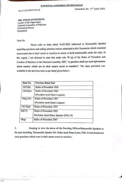 سوالات اور توجہ دلاؤ نوٹس مسترد کرنے کا ریکارڈ وجوہات کے ساتھ عوام کی آگاہی کےلئے جاری کردیا گیا