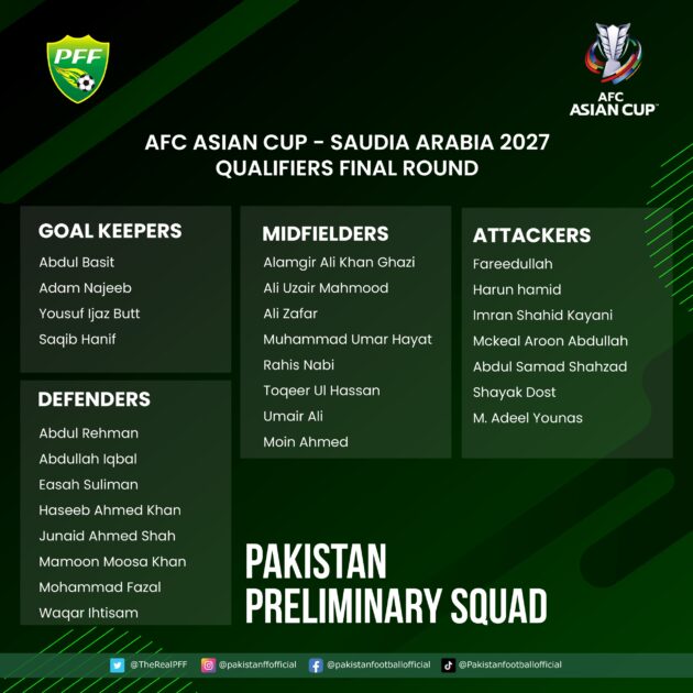 پاکستان فٹبال فیڈریشن نے شام کے خلاف اے ایف سی ایشین کپ 2027 کوالیفائر کے پہلےآوے میچ کے لیے ممکنہ کھلاڑیوں کا اعلان کر دیا ہے