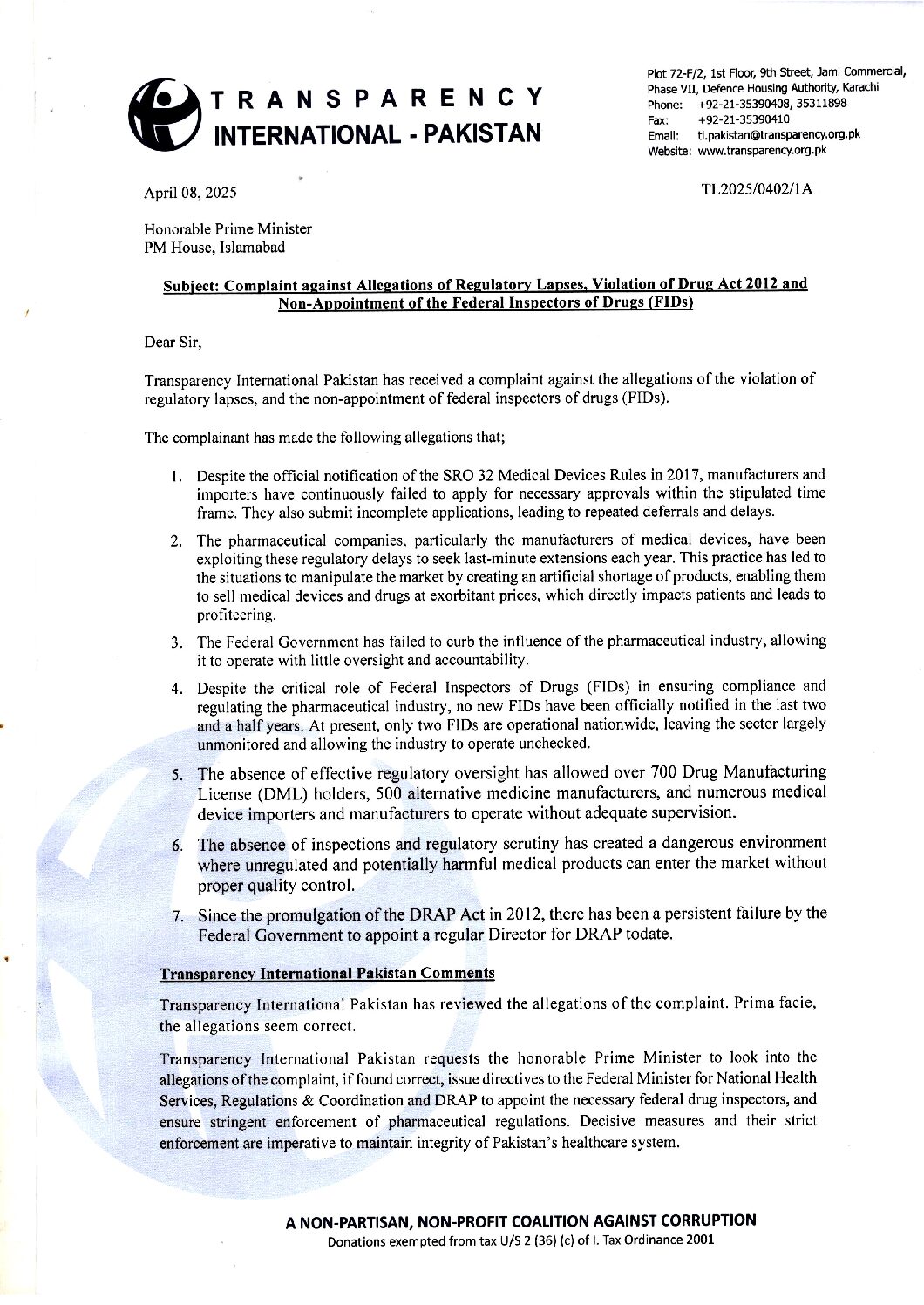 اسلام آباد (عمر فریدون) ٹرانسپیرنسی انٹرنیشنل (ٹی آئی) پاکستان نے وزیر اعظم شہباز شریف کو خط لکھ کر دوا سازی کے شعبے میں مبینہ ریگولیٹری ..مزید پڑھیں