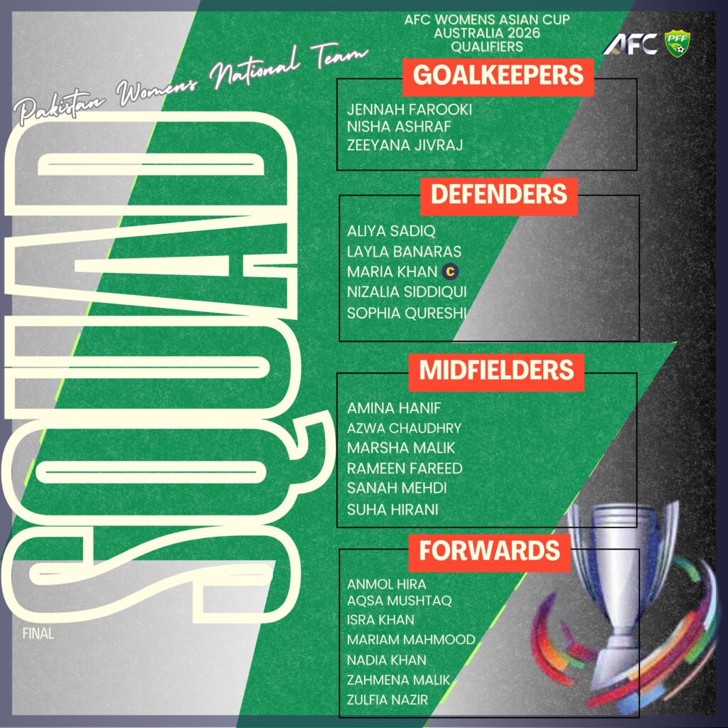 Lahore (Syed Javed Hassan S): The Pakistan Football Federation (PFF) has named a squad for the upcoming AFC Women’s Asian Cup 2026 Qualifiers, set to take place in Jakarta, Indonesia from June 29 to July 5.
