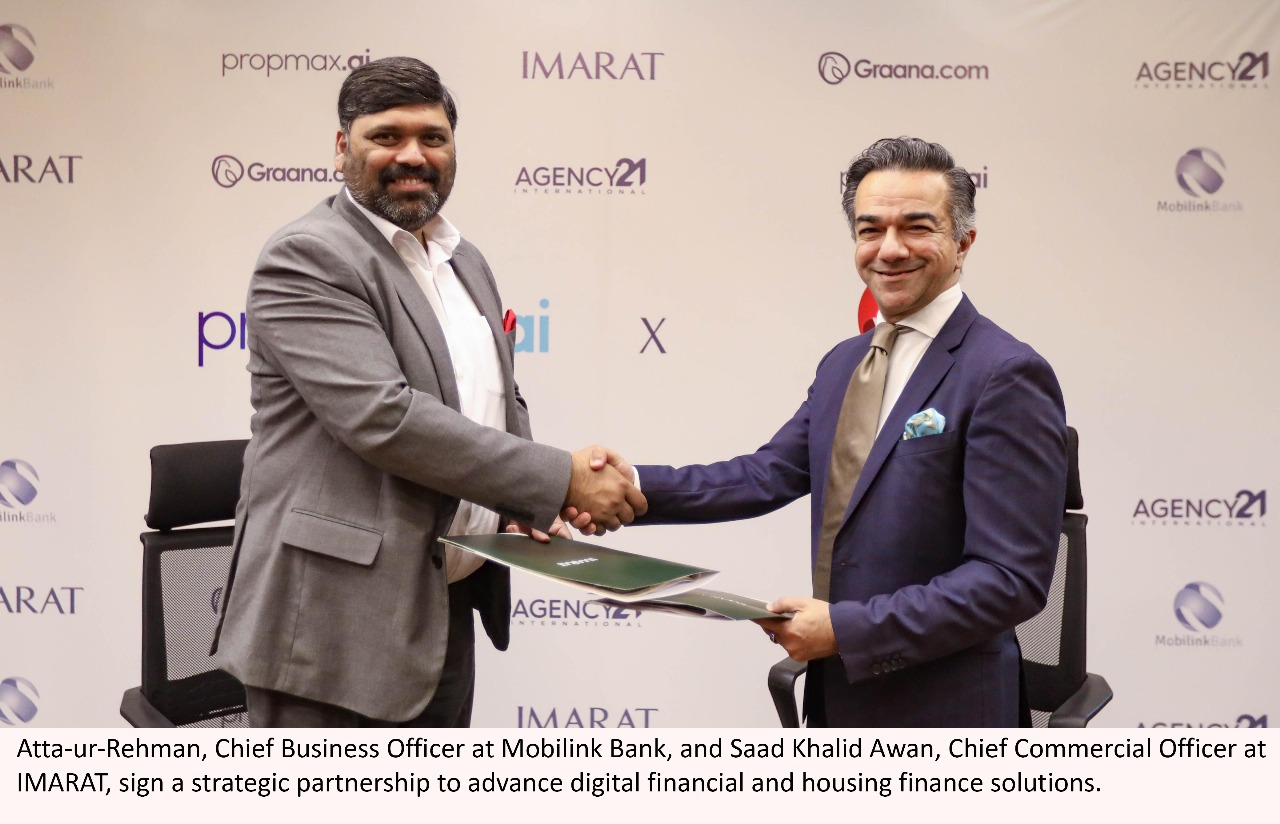 Islamabad (Zahid Yaqoob Khawaja): Pakistan’s leading digital microfinance bank, Mobilink Bank has entered into a strategic partnership with IMARAT Group, one of the country’s premier real estate conglomerates, to enhance access to housing finance, and drive economic empowerment through technology-driven banking solutions.